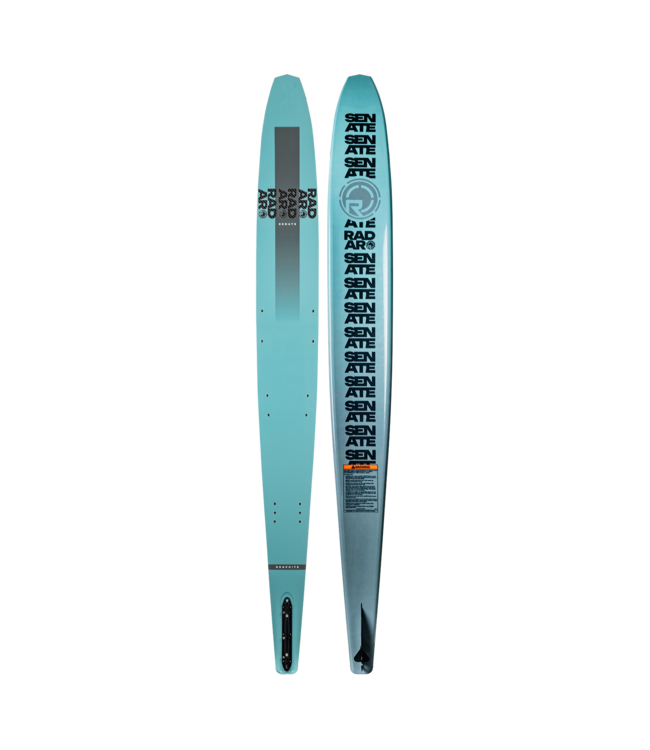 The 2026 Radar Senate Graphite shares the exact same Vapor-derived shape as the Alloy — same tunnel, same bevels, same 0.2” Performance Width. What separates it is what’s inside. Where the Alloy uses Paulownia wood stringers for dampening, the Graphite runs a full carbon fibre wrap over a polyurethane Aero Core. That swap changes everything about the feel: more snap out of the turns, more drive across the wakes, more energy stored and released on every pass. The Aero Core keeps the ride composed and predictable enough for open-water sessions, but the carbon unleashes real speed and angle when you need it. As we cover in our 2026 Radar buying guide, the Graphite is for advanced and course-focused skiers running 31–34 MPH who want Vapor-level performance in a shape that still has a forgiving moment to collect yourself if you get slightly out of position.