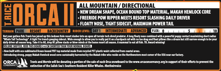 Travis and Mervin will be donating a portion of the sale of each Orca snowboard to the www.orcaconservancy.org in support of their efforts to prevent the extinction of the Salish Sea’s Southern Resident Killer Whales. #betheirvoice