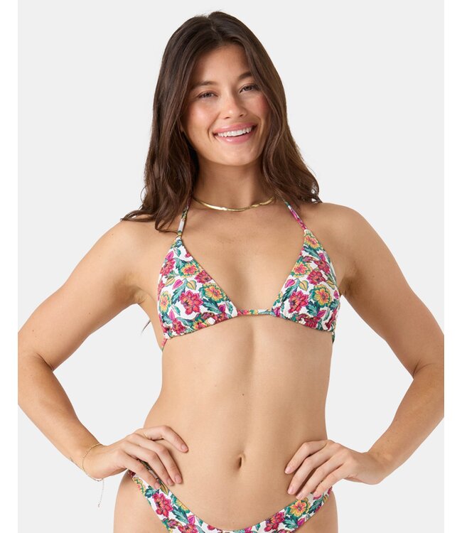 The Roxy Beach Blossom Mini Tiki Triangle Top features a playful printed butter design with adjustable tie straps for a customizable fit. Offering low support and removable cups, this triangle top combines comfort with a flattering silhouette. Made from a Read more.