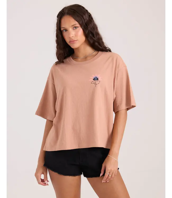 Bliss, with a little attitude. This boxy, waist-length crew tee comes in a mellow Pale Khaki and hits with a bold back graphic: a blown-up flower stamped with VOLCOM STONE. Soft cotton keeps it all-day comfy, while the loose fit lets you move from coffee Read more.
