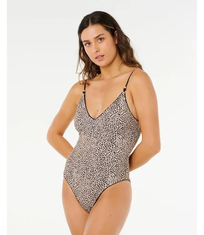 Coastal Instinct Cheeky One Piece Swimsuit delivers a deep V neckline, high-cut legs, and cheeky coverage. Made with stretch recycled poly texture, it includes adjustable straps, removable padding, and metal logo trim for a bold beach statement.