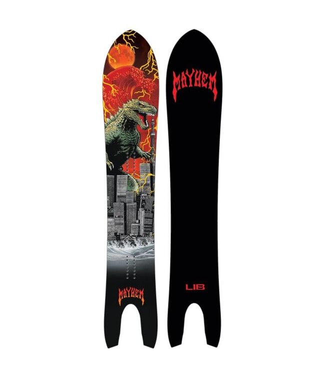 Go big or go bigger...introducing Matt Biolos’s Japow inspired fluff floating corduroy trench monster. Born in the sea on one of Matt’s surf shaping trips to the land of the rising sun Lib Zilla comes to life when frigid Siberian winds cross the the Sea of Japan and blanket the Islands mountains and valleys with monstrous amounts of snow. Progressive sidecuts carve groomed resort days and a long smooth entry nose floats all angles of pow while the deep swallow settles and adds control. Art by Jim Zappella mutant prehistoric reptile terror by Lib x Mayhem.