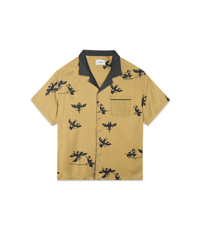 A vibrant rayon resort shirt featuring custom "Swoopy Boy" artwork. Lightweight, breathable, and designed with a relaxed fit for an effortless summer aesthetic.